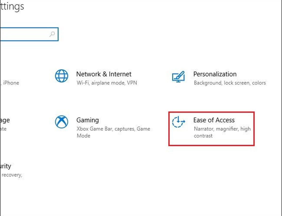در تنظیمات روی گزینه Ease of Access کلیک کنید و وارد آن شوید.